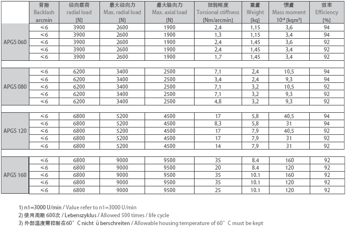 APGS系列行星减速器 完美应用在需求高性能,高精度定位和重复定位的案例中。特别针对齿轮齿条的应用,减速器增加了轴承,从而达到更大的轴向力和径向力。功率密度高,且运行平稳,可与多种电机法兰配合使用,轻松连接伺服电机。 APGS系列特征: 高附加载荷;高功效;高功率密度;高扭转刚度;高负载能力;高动态性能 该系列减速器典型应用包括精密回转轴驱动,龙门型设备,物料搬运轴驱动,电子生产线轴驱动。应用行业包括物料搬运,自动化,航空航天,机床和桁架机器人。