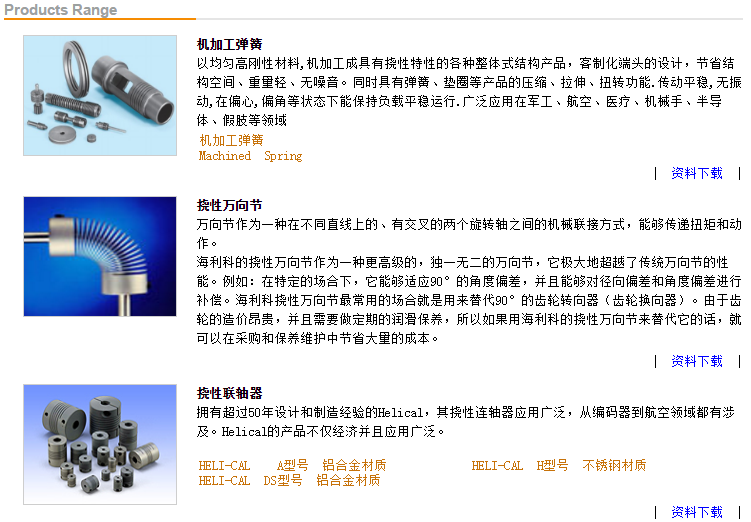1958年George Sabadash运用全新的理念发明了Helical挠性连轴器。在获得良好的市场认可后,George知道Helical挠性连轴器是非常符合市场需求的,并且George和他合作的伙伴们一次又一次的因市场的需求,增加和完善产品系列。到目前Helical联轴器已有三大产品系列: Flexible Coupling,Machined Spring,U-joint。
