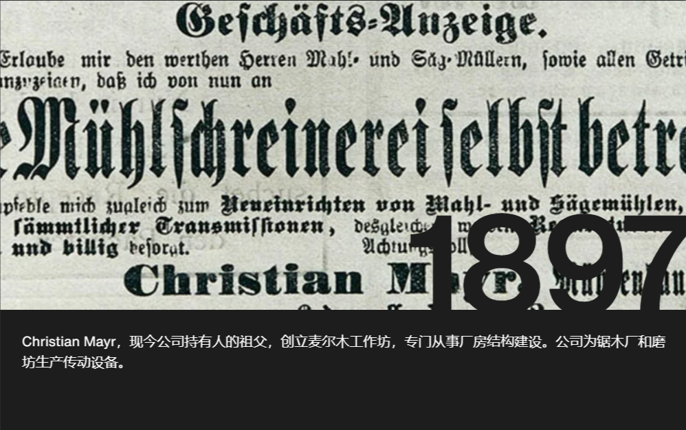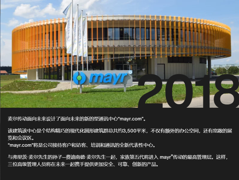 Mayr是动力传动领域最传统、也是最具创新意识的德国公司之一。公司创立于1897年,从起步时的微不足道一直成长为全球市场领袖 – 回顾历史,这个来自Allgäu地区的家族企业有着100多年的成功史。