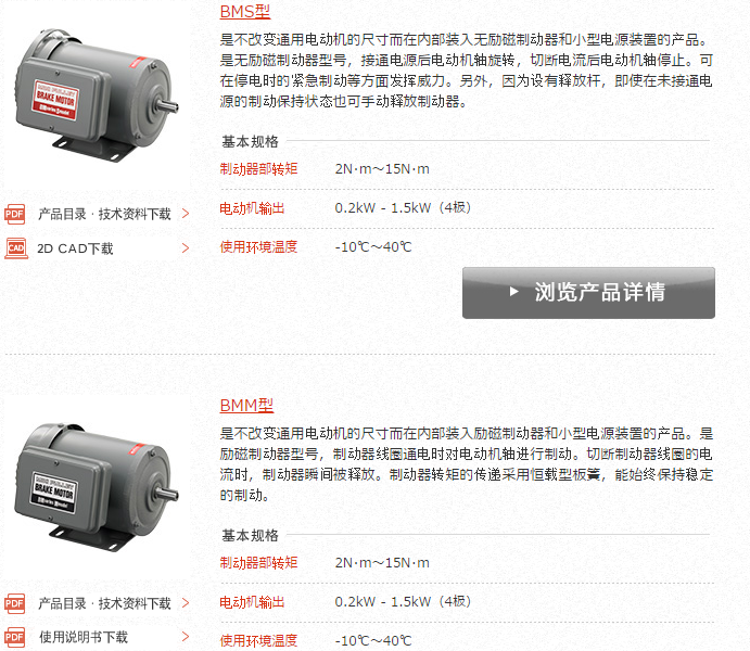 是不改变通用电动机的尺寸而在内部装入励磁制动器或无励磁制动器的产品。其特点是内置小型电源,操作简便。
