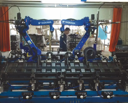 北汽福田安凯车桥机器人焊接生产线 选用的机器人: 日本安川弧焊机器人MA1400,垂直多关节型六自由度工业机器人,承载能力3kg,重复定位精度±0.05mm。 机器人的周边设备: 1.以PC为基础的安川机器人控制系统,包括带有熟悉的视窗操作界面的控制面板; 2. 变位机; 3.清枪剪丝机; 4.焊接系统,包括焊接电源、专用焊枪等; 5.焊接传感器及系统安全保护设施; 6.电气柜。