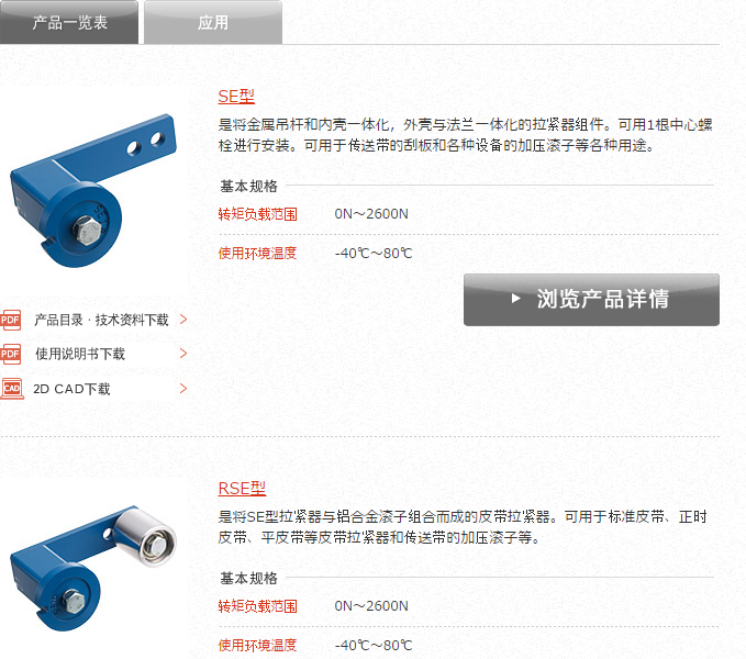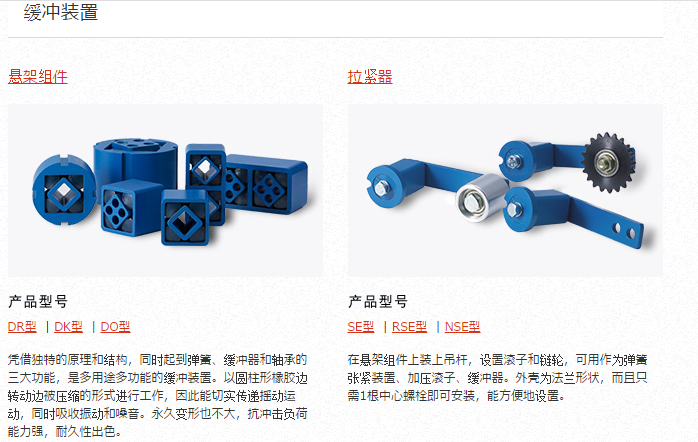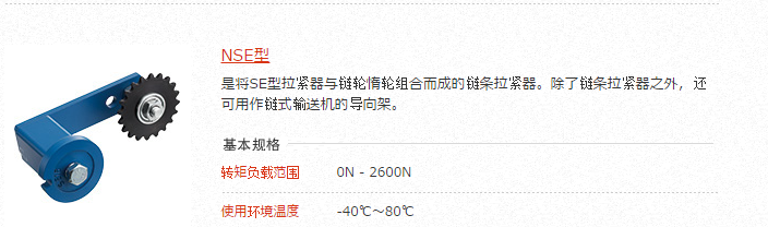 在悬架组件上装上吊杆,设置滚子和链轮,可用作为弹簧张紧装置、加压滚子、缓冲器。外壳为法兰形状,而且只需1根中心螺栓即可安装,能方便地设置。另外,可根据使用负载范围选择惰轮的安装孔,能满足较大的负载范围。型号有无惰轮的SE型、装有滚子惰轮的皮带拉紧器RSE型。备有装有链轮惰轮的NSE型。