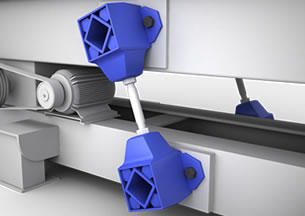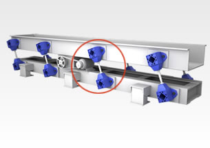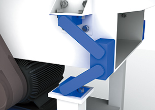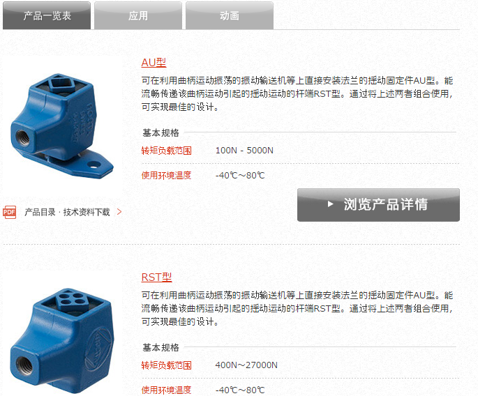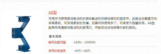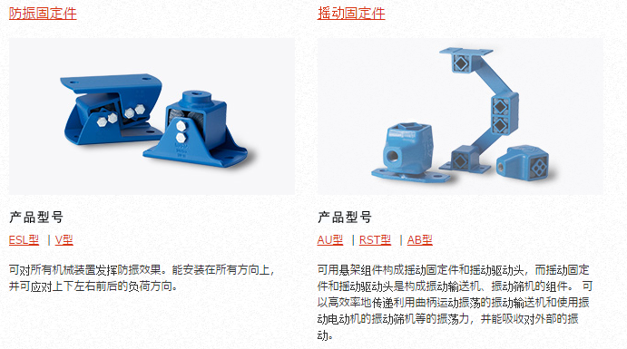可用悬架组件构成揺动固定件和揺动驱动头,而揺动固定件和揺动驱动头是构成振动输送机、振动筛机的组件。可在利用曲柄运动振荡的振动输送机等上直接安装法兰的揺动固定件AU型。能流畅传递该曲柄运动引起的揺动运动的杆端RST型。通过将上述两者组合使用,可实现最佳的设计。另外,备有使用振动电动机的振动输送机和振动筛机的固定件AB型。AB型能有效传递振动电动机的振荡力,并能吸收对地板等外部的振动。