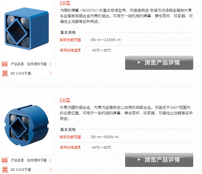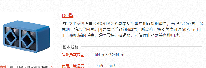凭借独特的原理和结构,同时起到弹簧、缓冲器和轴承的三大功能,是多用途多功能的缓冲装置。结构上由金属内壳、外壳和圆柱形橡胶组成,在具有45°变位的内壳、外壳上压入圆柱形橡胶。其弹簧特性为非线性,以圆柱形橡胶边转动边被压缩的形式进行工作,因此能切实传递揺动运动,同时吸收振动和噪音。永久变形也不大,抗冲击负荷能力强,耐久性出色。