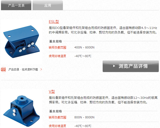 可对所有机械装置发挥防振效果。备有适合固有振动频率4.5~11Hz的中间频率域的ESL型和适合较高频域的V型。两种型号均能安装在所有方向上,并可应对上下左右前后的负荷方向。